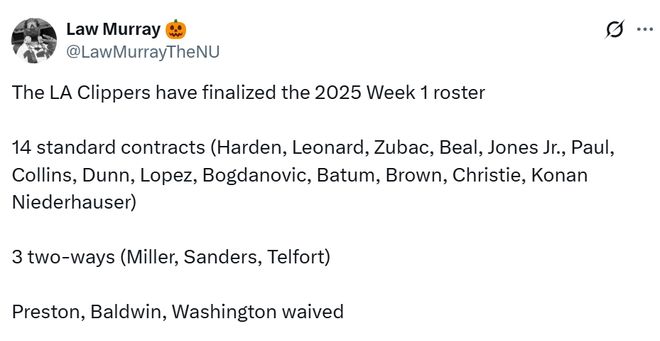 快船队目前的薪资非常接近硬工资帽,无法以满额阵容开启新赛季。在上述操作完成后,快船队将拥有14份标准合同和3份双向合同。