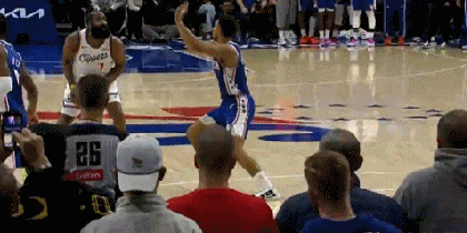 哈登示意打手犯规,手都摇出花了,裁判仍然无动于衷